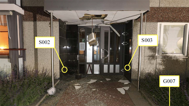 ”Explosionen orsakade materiella skador däribland en krossad fönsterruta samt skador kring entrén”, skriver åklagaren.