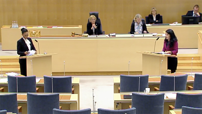 Foto: Skärmdump Riksdagens Webb-TV Alice Bah Kuhnke (MP) i debatt med Amineh Kakabaveh (V)