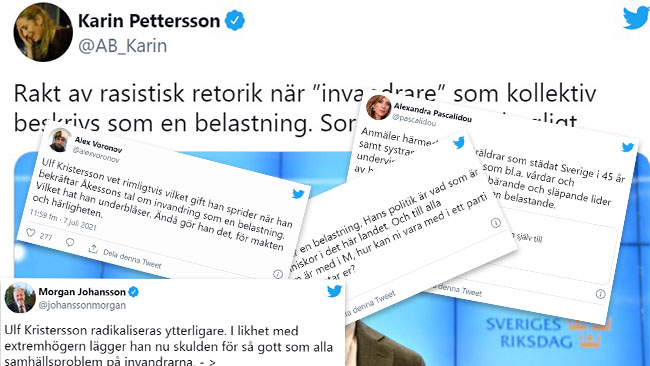 På Twitter går vänstern till hårda angrepp på Moderaternas partiledare Ulf Kristersson efter hans uttalande om att invandringen till Sverige har ”blivit en belastning” i en radiointervju med P1-morgon. Morgan Johansson (S) jämför Kristersson med ”extremhögern” och Aftonbladets kulturchef kallar det för ”rakt av rasistisk retorik”.