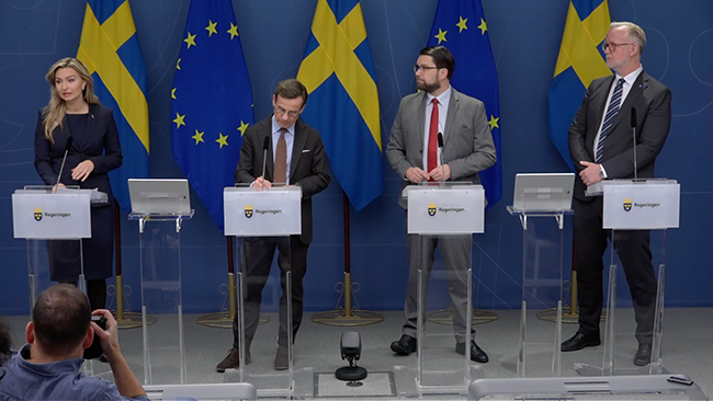 På pressträffen medverkar även de övriga samarbetspartiernas partiledare Jimmie Åkesson, Ebba Busch och Johan Pehrson.