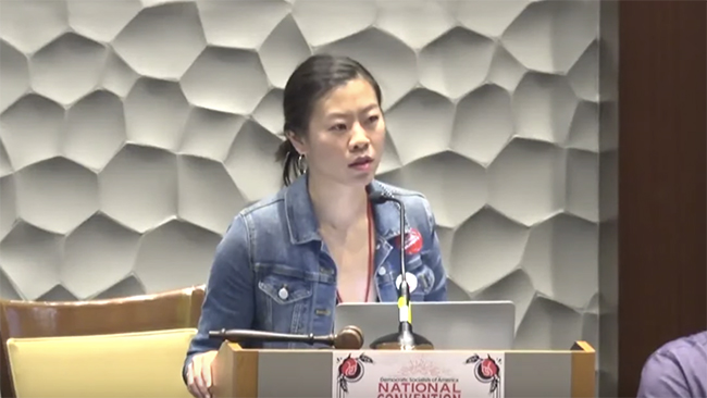 DSA:s kongress livesändes på webben under helgen. En webbsändning som senare har plockats ner. Men ett par klipp från kongressen har snabbt blivit virala. Det hela inleds med att en ledamot, Jesse Jackson från Sacramento, begär ordet.