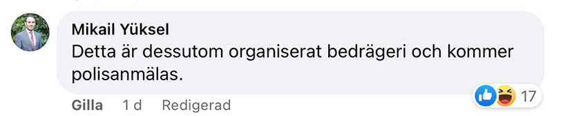 I en kommentar till ett av hans inlägg på Facebook kallar Yüksel det hela för ”organiserat bedrägeri”.