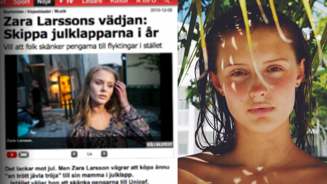Den sjätte december i år, bara ett par veckor innan jul, berättar tidningen Aftonbladet att artisten Zara Larsson tycker man ska ge pengar till flyktingar istället för att köpa julklappar. Det hade Zara Larsson själv förklarat i ett känslosamt inlägg på Instagram.